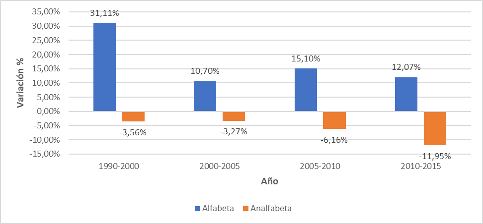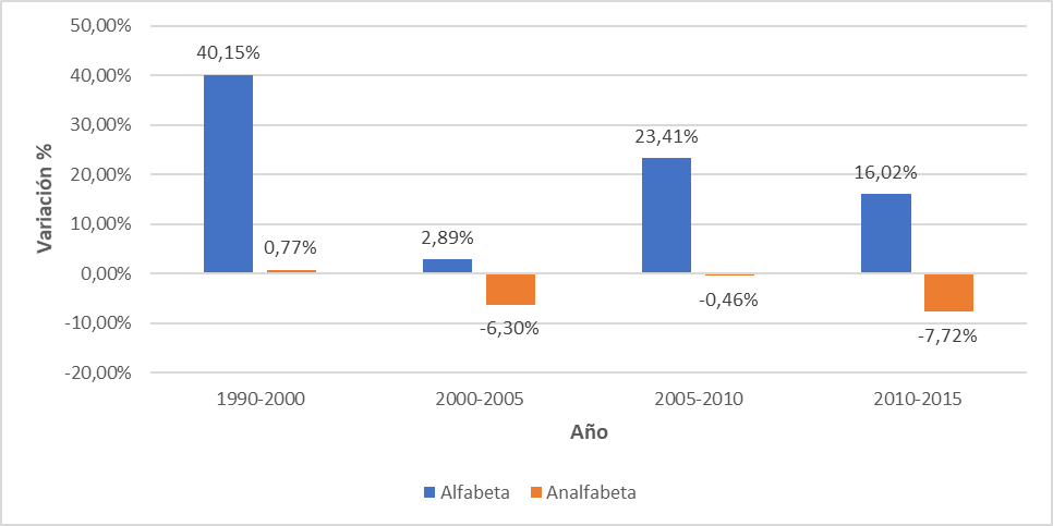 Por otra parte, en la Figura 2 se muestra cómo en el periodo 1990-2010 la población alfabeta indígena tuvo un incremento del 40.15 %. En cambio, durante el periodo 2000-2005 parece no haber cambios significativos y la tasa de alfabetización se mantiene en 2.89 %. Se presentó un incremento en la tasa de alfabetización entre 2005-2010 de 23.41 % y de 16.02% entre 2010-2015.