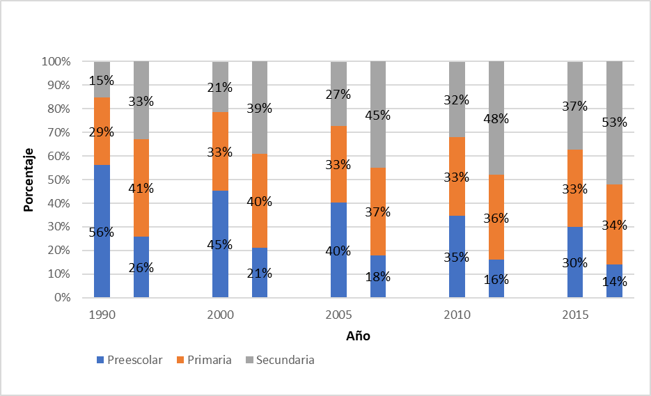 Para México, en cuanto al indicador nivel de instrucción de una persona, podemos observar en la Figura 3, cómo la tasa de población no indígena de 15 años y más, sin grados aprobados o únicamente con grados aprobados en preescolar o kínder, pasó de 26 % en 1990 a 14 % en 2015, lo cual representa un avance positivo. Se debe resaltar el incremento en la tasa de población no indígena de 15 años y más con secundaria, la cual pasó de 33 % en 1990 a 53 % en 2015. Lo anterior refleja un cambio en la estructura del nivel de instrucción, ya que para 2015 se presentaron mayores tasas en secundaria (53 %), una disminución de población de 15 años y más con primaria terminada en 6 años, al pasar de 41 % en 1990 a 34 % en 2015.