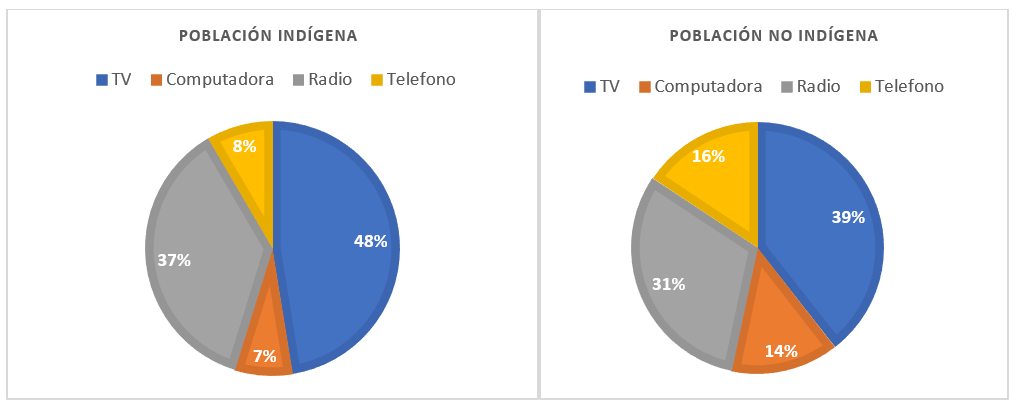 Fuente: elaboración propia con datos del INEGI (1990, 2000, 2005, 2010, 2015).En cambio, los resultados para la población indígena no son muy alentadores. Podemos observar en la Figura 4 que la tasa de población de 15 años y más sin grados aprobados o únicamente con grados aprobados en preescolar o kínder es alta en comparación con la población no indígena; por ejemplo, en el año de 1990 representaba un 56 %, aunque disminuyó a 30 % en 2015. En 2015, predomina la población indígena con estudios de secundaria (37 %), en cambio la población con estudios de preescolar de 15 años y más alcanzo el 30 %. Podemos observar en la Figura 4 que las poblaciones indígenas tienen acceso limitado a las TIC; por ejemplo, las TIC con mayor acceso son la televisión (48 %) y la radio (37 %) seguidas por el teléfono (8 %) y la computadora (7 %). Por otra parte, la población no indígena presenta un patrón similar, donde la televisión (39 %) ocupa el primer lugar, seguido por la radio (31 %). En el segundo bloque, el teléfono (16 %) y la computadora (14 %). En resumen, la tendencia en la adopción tecnológica es desigual en la población indígena y no indígena; se observa un mayor acceso a las TIC en población no indígena.