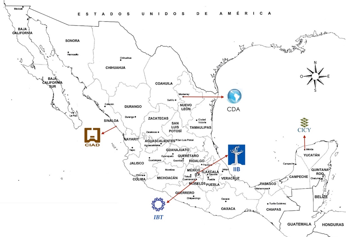 La investigación exploratoria de donde emerge el presente artículo se basa en el paradigma cualitativo en donde realicé entrevistas en profundidad, observación no participante y revisión documental. Durante el trabajo de campo entrevisté a investigadores y técnicos académicos de cinco instituciones de investigación científica mexicanas: el Instituto de Investigaciones Biomédicas (IIB) y el Instituto de Biotecnología (IBT) de la Universidad Nacional Autónoma de México (UNAM), ubicados en Ciudad de México y Cuernavaca, respectivamente; el Centro de Investigación Científica de Yucatán (CICY), ubicado en Mérida; el Centro de Investigación en Alimentación y Desarrollo-Unidad Mazatlán (CIAD), ubicado en dicha ciudad; y el Centro del Agua para América Latina y el Caribe (CDA), perteneciente al Instituto Tecnológico y de Estudios Superiores de Monterrey (ITESM), con sede en dicha ciudad (ver figura 1). Adicionalmente, realicé visitas a los laboratorios y revisión documental de bibliografía especializada y de documentos institucionales de cada centro de investigación (informes de gestión, publicaciones oficiales, comunicados, páginas web, etc.).