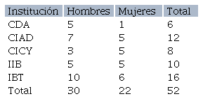 En total, realicé entrevistas a 52 personas, de las cuales 30 son hombres y 22 son mujeres. Las entrevistas fueron realizadas entre el 21 de mayo de 2018 y el 18 de junio de 2019. Para ello, en primer lugar, contacté a los directores de cada institución y luego, con su aprobación, escribí por correo electrónico a los investigadores e investigadoras de cada institución solicitándoles una entrevista y, de ser posible, una visita a los laboratorios donde realizan sus labores cotidianas. En los casos del IIB, del IBT y del CICY, dado su alto número de miembros, realicé una selección aleatoria de las personas contactadas y seguí la estrategia de bola de nieve para contactar a otros miembros de las instituciones. De acuerdo con los informes de gestión de cada institución del año 2018, el IIB tenía 83 investigadores y 82 técnicos académicos; el CICY tenía 74 investigadores y 129 técnicos académicos, y el IBT tenía 102 investigadores y 97 técnicos académicos. En los otros dos casos, contacté a todos los investigadores titulares (21 de la Unidad Mazatlán del CIAD, 11 del CDA) y a algunos de sus técnicos académicos (el número de personas entrevistadas por institución y género se muestra en la Tabla 1). Las edades de las personas entrevistadas oscilaron entre los 31 y 80 años. La duración promedio de cada entrevista fue de una hora y, en algunos casos, se realizó más de un encuentro por persona. Las temáticas generales de la entrevista fueron las siguientes: 1) trayectorias y recorridos en el trabajo científico; 2) descripción de las actividades cotidianas en la producción de conocimientos; 3) interacción y organización del trabajo con colegas y otros investigadores; y 4) relación con las instituciones y las políticas públicas de ciencia y tecnología en los procesos de investigación.