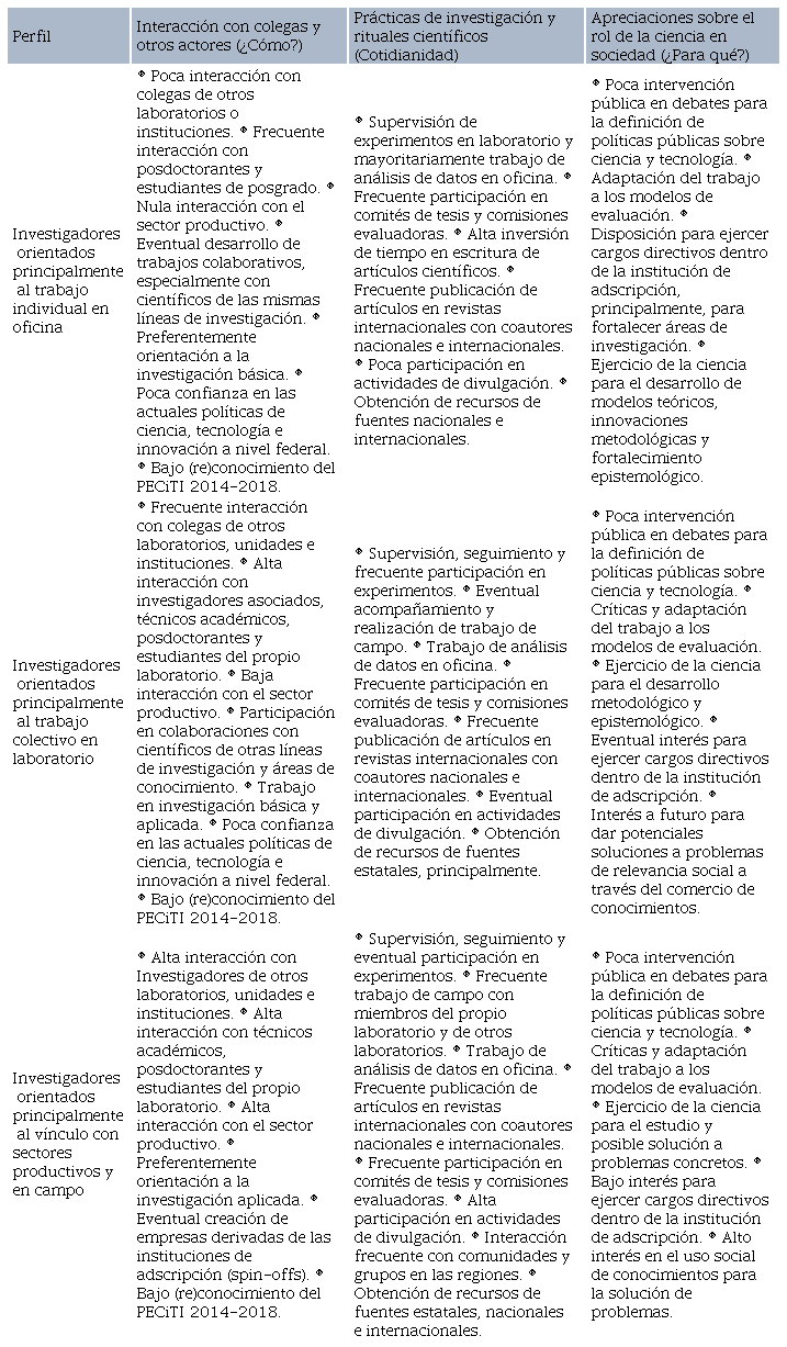 Para la identificación de los perfiles científicos acudí a la recopilación de relatos de las personas entrevistadas sobre 1) ¿cómo se hace ciencia?, 2) ¿cuál es la cotidianidad?, y 3) ¿para qué se hace ciencia? Cada una de esas preguntas contiene las categorías con las cuales hice el análisis y descripción de los estilos de investigación: 1) interacción con colegas y otros actores, 2) prácticas de investigación y rituales científicos, y 3) apreciaciones sobre el rol de la ciencia en sociedad. Llevar las categorías al plano empírico y comprender su interrelación en la cotidianidad de las instituciones y los laboratorios me permitió explorar la manera como se hace ciencia en México y delimitar algunas de sus características.
