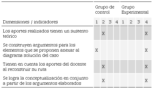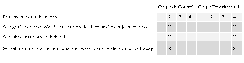 Con respecto al Grupo Control se visualizó que los participantes de los equipos de trabajo se organizaron fácilmente y seleccionaron el líder en cada uno, dejándole a este la mayor responsabilidad frente a la solución del caso planteado. En este mismo escenario, se observó que las participaciones de los estudiantes se limitaban a opinar y comentar deliberadamente sin ninguna correlación frente a la temática y el propósito del caso. Finalmente, en este grupo se corroboró que no hubo consulta de material complementario ni necesidad de programar encuentros adicionales, puesto que ya tenían conocimiento sobre la metodología convencional para foros. En la mayoría de los equipos de este grupo se hizo caso omiso a las intervenciones o recomendaciones dadas por el docente como redireccionamiento al desarrollo del trabajo. El registro de la observación directa por parte del tutor mostró que los integrantes de los equipos de trabajo en el Grupo Experimental lograron una organización y corresponsabilidad en el desarrollo de la tarea y una adecuada comprensión del caso a trabajar. Por otra parte, se sintieron más motivados por su participación y su calidad, la cual se sustentaba en argumentos elaborados y con la colaboración de todos los participantes. La participación exigió mayor preparación (del docente y de los estudiantes) para el Grupo Experimental, quienes debieron consultar literatura sobre el tema y participar en encuentros sincrónicos adicionales para comprender con mayor precisión no solo el caso planteado, sino el uso de la herramienta. Del mismo modo, hubo manifestaciones de rechazo por parte de los estudiantes, quienes expresaron desconocer el uso de la herramienta y la necesidad de dedicar más tiempo para la resolución del caso. Esto debió enfrentarlo el docente a través de motivación y los encuentros extra que realizó.