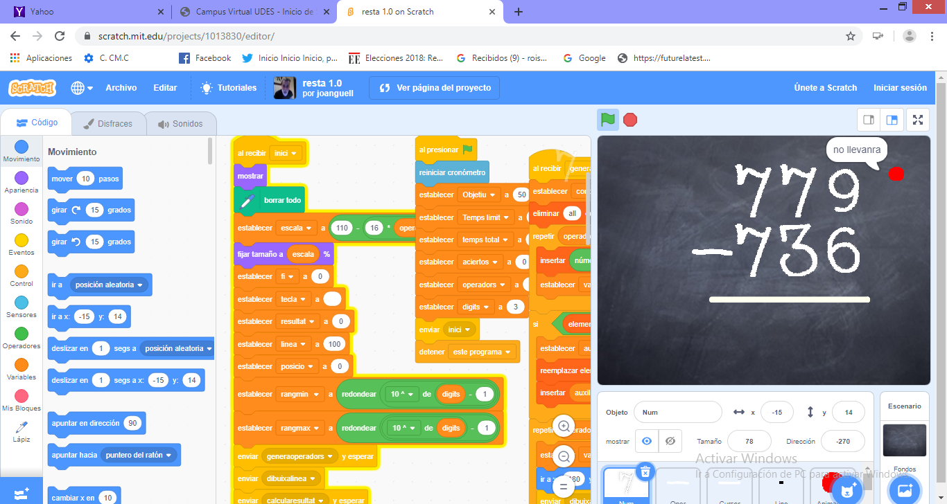 En otras palabras, el programa Scratch es utilizado como una herramienta pedagógica para generar juegos digitales que incentiven el aprendizaje de las matemáticas de forma significativa; en este caso el juego se usó para el aprendizaje de la resta, proponiendo unos retos continuos para generar unos cambios en la estructura mental de los educandos. En este contexto, Márquez-Mosquera y Olea-Isaza (2020) explican que debe valorizarse y dársele nuevamente mucha importancia al juego «en los procesos de formación de la escuela, porque le permite al niño recrear y comprender el mundo que lo rodea; y le brinda la oportunidad de socializar» (p. 169). En síntesis, el juego propicia en los estudiantes el aprendizaje significativo de la resta y el desarrollo de unas competencias para solucionar problemas matemáticos.