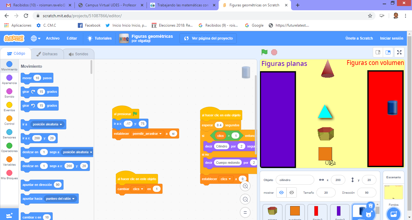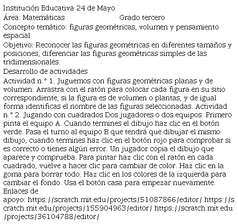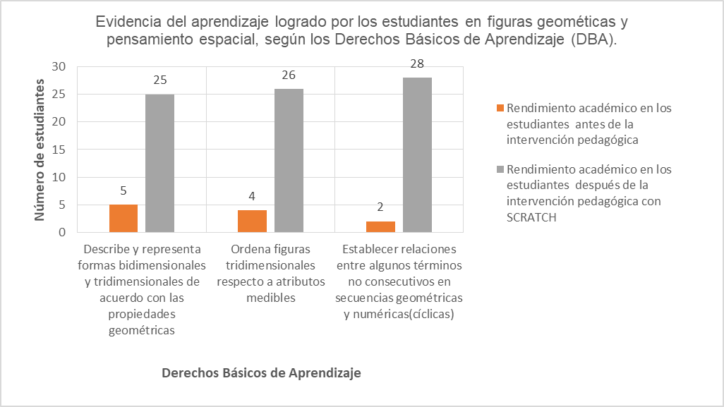 Es decir, al utilizar el programa Scratch como una herramienta pedagógica y transversal en el área de Matemáticas se generan procesos de aprendizaje integradores: en este caso, la apropiación de las figuras geométricas y el pensamiento espacial le permite al estudiante desarrollar unas competencias para diferenciar las figuras geométricas simples de las tridimensionales e identificar características similares en cada una de ellas al utilizar Scratch. En este tipo de actividades se generan procesos de aprendizaje significativo y motivantes para los estudiantes de básica primaria.
