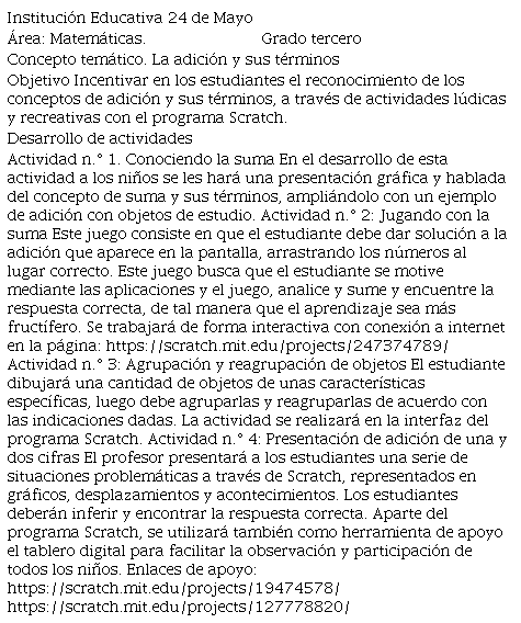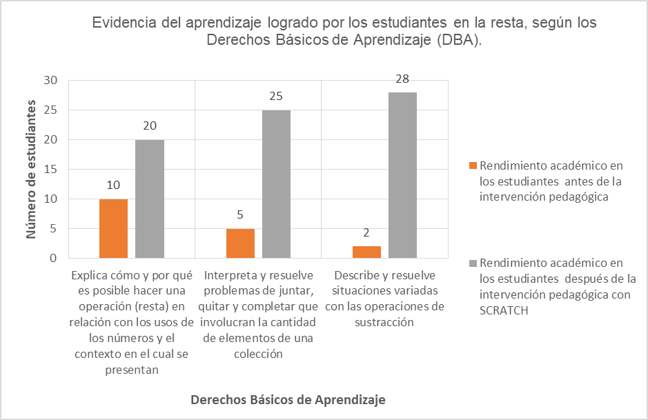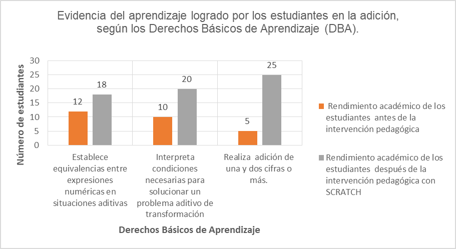 Con la intervención pedagógica realizada de manera transversal en la asignatura de Matemáticas con el programa Scratch se evidencia que los estudiantes desarrollaron unas competencias de pensamiento numérico y de sistemas numéricos, exponen un raciocino sobre lo variacional; asimismo expresan unas reflexiones sobre lo espacial y los sistemas geométricos, y afianzaron su pensamiento aleatorio que contribuye a unos procesos de aprendizaje significativo y autónomo. En lo que corresponde a los logros de apropiación de la guía de aprendizaje 1: la adición, se evidencia el desarrollo de competencias, tales como la capacidad de establecer equivalencias entre expresiones numéricas en situaciones aditivas e interpretar las condiciones necesarias para solucionar un problema aditivo de transformación realizando adición de una y dos cifras o más. García et al., (2006) explican que cuando los alumnos comprenden el sistema decimal, pueden también llegar a comprender «los conceptos y procedimientos implícitos en los algoritmos de suma y resta» (p. 95), y que en esa situación son capaces de implementar una estrategia de solución de problemas que facilita la comprensión y el razonamiento de los problemas.