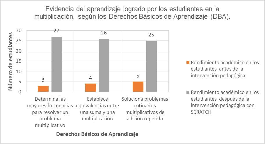 Así, con respecto a la integración del programa Scratch como recurso didáctico, el primer paso fue incentivar a los estudiantes a comprender el sistema decimal para que tuvieran una apropiación significativa de los números y, por ende, la compresión de los procesos de adición. En lo que concierne a los logros de comprensión de la Guía de aprendizaje 2: la multiplicación, se evidencia el progreso de competencias, tales como la capacidad de determinar las mayores frecuencias para resolver un problema multiplicativo; establecer equivalencias entre una suma y una multiplicación, y solucionar problemas rutinarios multiplicativos de adición repetida. Los investigadores Cardona Carvajal et al., (2016) exponen la importancia de las tablas de multiplicar para los estudiantes de básica primaria «como primer paso para entrar a las matemáticas y la multiplicación como proceso para hallar el producto de los factores son dos temas de interés y que servirán para desenvolverse en la cotidianidad» (p. 54). En la intervención pedagógica se incentivó a los estudiantes, desde su contexto, para que hicieran apropiación de la multiplicación y se trabajó mucho para que comprendieran fácilmente el producto y los factores. Igualmente, se potencializaron los procesos de adición o suma para una compresión significativa de la multiplicación.