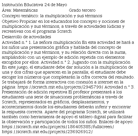 Resumen: este artículo es el resultado de una investigación destinada a diseñar y poner en práctica una propuesta metodológica para utilizar el software Scratch en un curso de educación primaria. El propósito de esta investigación fue potenciar la generación de aprendizaje significativo de treinta estudiantes de Matemáticas de tercer grado en la Institución Educativa 24 de Mayo del municipio de Cereté en el departamento de Córdoba, Colombia. En la investigación se utilizaron un enfoque cualitativo y un marco metodológico descriptivo. Así, fue posible estudiar el uso del software Scratch en el desarrollo de las clases de Matemáticas. Se elaboró un método de investigación-acción educativa. El diseño de la investigación fue cualitativo-descriptivo y el tipo de análisis fue interpretativo. Al final de la intervención del uso del software Scratch en las clases de matemáticas de tercer grado, se fortaleció el pensamiento numérico, ya que los estudiantes pudieron interpretar fórmulas y resolver problemas relacionados con la suma, la resta y la multiplicación de los números naturales. Como demuestran los resultados presentados, se estimuló el pensamiento lógico-matemático, lo que condujo a la generación de un aprendizaje significativo y al desarrollo de habilidades del siglo XXI, como el aprendizaje del pensamiento creativo, el trabajo en colaboración y el aprendizaje continuo.