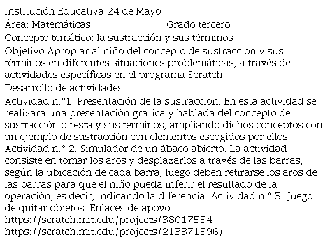 En la presente investigación se demuestra la importancia que puede tener el uso pedagógico de las Tecnología de la información y las Comunicaciones, TIC, en los procesos educativos, especialmente en los estudiantes de básica primaria para generar un aprendizaje significativo e innovador. En este aspecto, la experiencia internacional muestra cómo después de diseñar políticas de ciencia y tecnología más horizontales varios países han sido capaces de establecer procesos de innovación más maduros y de mayor impacto para las personas ( Sarthou, 2018). En este caso, se realizó una intervención pedagógica integrando el software Scratch, de manera transversal con la asignatura de Matemáticas. Se desarrollaron cuatro guías de aprendizaje para generar procesos de aprendizaje significativo, dinámicos e interactivos utilizando las TIC. La implementación se llevó a cabo con los estudiantes de Matemáticas del grado tercero de primaria de la Institución Educativa 24 de Mayo del municipio de Cereté en Córdoba, Colombia.