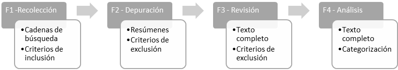 La revisión sistemática consta de tres fases esenciales: la planificación, la ejecución y el informe de los resultados ( Kitchenham, 2004). Siguiendo estas fases de manera rigurosa, es posible obtener una comprensión más profunda del fenómeno estudiado, lo que ayuda a identificar tendencias y carencias en estudios originales que permiten sintetizar las evidencias de las investigaciones realizadas sobre el tema ( Sánchez-Meca & Botella, 2010; Sobrido Prieto & Rumbo-Prieto, 2018; Villada Zapata et al., 2016).