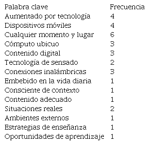 No todos los autores dedicaron un fragmento de su trabajo a definir el aprendizaje ubicuo, algunos, toman como un hecho la comprensión del concepto y sus bondades para la formación. Sin embargo, la mayoría de los artículos sí describieron explícitamente el concepto. En la Tabla 2 se muestra la frecuencia en que aparecen diversas palabras clave en la definición de aprendizaje ubicuo de cada artículo.
