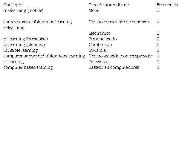 El aprendizaje móvil (mobile learning o m-learning)es el tipo de aprendizaje que más se repite en los artículos. Hung et al., (2014), Wen y Zhang (2015), De Sousa Monteiro et al., (2016), Valenzuela-Valdes et al., (2016), Moreno-López et al., (2017), Cárdenas-Robledo y Peña-Ayala ( 2019), y Peña-Ayala y Cárdenas-Robledo (2019), son los autores que utilizan al aprendizaje móvil para sustentar al aprendizaje ubicuo, ya que consideran que el primero, representa la característica fundamental de movilidad que da cabida al segundo, al permitirle eliminar barreras espaciales y temporales al montarse sobre dispositivos móviles.