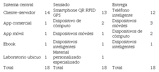 Los tipos de sistemas tecnológicos manejados por los autores son variados y se resumen en la Tabla 4; sin embargo, en las implementaciones de aprendizaje ubicuo identificadas, se observaron tres elementos esenciales: el sistema base que cura, a través del poder de cómputo, los contenidos educativos; el mecanismo de sensado del contexto del sujeto en cuestión y, un medio para hacer llegar los contenidos al sujeto. Los más utilizados fueron: