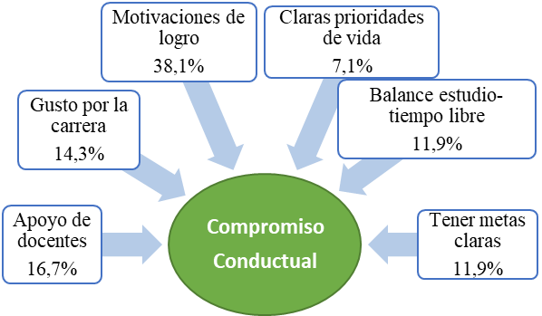 Los estudiantes reportaron distintos contenidos que asociaron como factores que contribuyen al desarrollo de Compromiso Académico Conductual, donde el alcance de logros y metas adquiere una relevancia mayor en su experiencia con un 57,1 % de los contenidos referidos, asociados a este aspecto en la forma de 3 grandes contenidos: motivaciones de logro, claridad en las prioridades de la vida y metas claras.