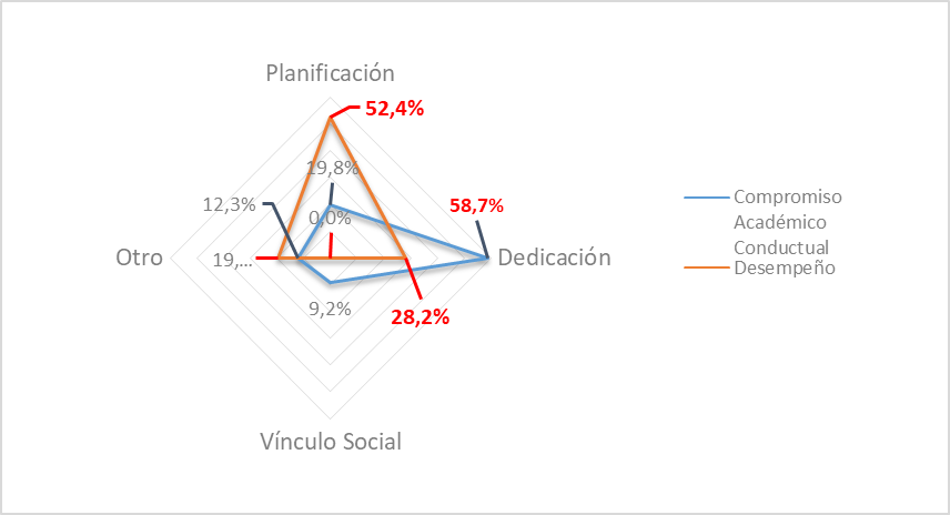 Por otro lado, los correlatos conductuales difieren entre estudiantes con alto desempeño y estudiantes con altos niveles de compromiso. Interesa el contraste en las formas de abordaje o afrontamiento de los bajos niveles de Compromiso Académico Conductual. Esto podría reflejar que los estudiantes no enfrentan los problemas de su vida académica desde los factores causales, sino más bien, recurren a aspectos variados donde cobran valor los factores relacionales. También podría significar que, en la experiencia del estudiante, ambos aspectos no corresponden a dos polos distintos de un mismo continuo.