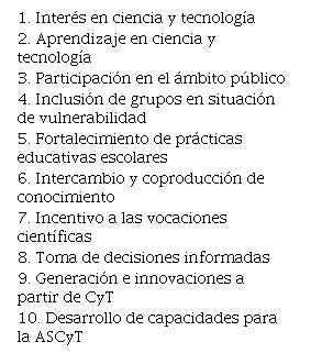Ahora bien, el Observatorio Colombiano de Ciencia y Tecnología (OCyT), que acompaña algunos procesos de políticas públicas de ciencia y tecnología y del Sistema Nacional de Ciencia Tecnología e Innovación (SNCTeI) de Minciencias, ha evaluado proyectos y programas de ASCTI financiados o ejecutados por Colciencias y ha desarrollado metodologías e indicadores para medir o evaluar los procesos de ASCTI. Específicamente, el desarrollo de indicadores de medición de la ASCTI es el resultado de un trabajo conjunto con Maloka (museo interactivo sobre ciencia y tecnología ubicado en Bogotá, Colombia). Según este proyecto, al hablar de la apropiación «se está pensando en un cambio que ocurre como producto de una intervención específica, en este caso de la participación de alguna actividad de Maloka» ( Arboleda et al., 2014, p. 25). De acuerdo con esto, los resultados parciales del proyecto arrojan que los indicadores de ASCTI no deben comprenderse como el cumplimiento de metas, sino categorías de medición con el fin de «comprender el papel cumplido por estas actividades en la democratización del conocimiento científico-tecnológico como propiciadoras de un posicionamiento crítico y situado de la ciencia y la tecnología» ( Arboleda et al., 2014, p. 14).