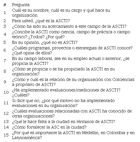 Con el fin de aportar a los debates sobre ASCTI en Medellín se realizaron entrevistas a actores relevantes del tema en la ciudad, lo que permitió definir qué y cómo evaluar los alcances, necesidades y expectativas de una evaluación de productos y procesos de apropiación. A continuación, se presentan generalidades de estas a modo de síntesis y sus análisis. Es necesario resaltar que, según todos los entrevistados, llegaron a trabajar en ASCTI por «casualidad», sobre todo en procesos de comunicación de la ciencia, así como en el diseño de experiencias. Además, todos, excepto uno de ellos, se relacionaron con estos procesos en su campo laboral y, posteriormente, los profundizaron académicamente. Al momento de ser entrevistados se desempeñaban como coordinadores y tenían al menos cinco años de experiencia de trabajo en el campo de ASCTI en Medellín y en Colombia. Esta característica fue utilizada como criterio de selección para invitarlos a participar de las entrevistas.