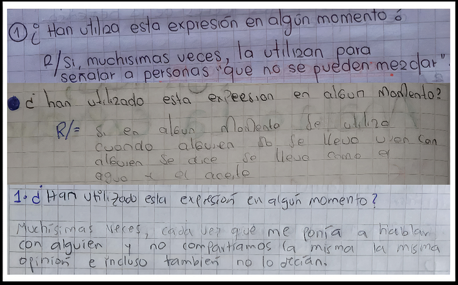 La mayoría de los estudiantes manifestó haber utilizado la expresión «somos como agua y aceite» en varias ocasiones, señalando algunas situaciones particulares de su uso. Por ejemplo, esta forma de lenguaje coloquial ha sido utilizada por los alumnos en su contexto inmediato para referirse a las diferencias de opiniones entre compañeros o a las malas relaciones que pueden existir entre las personas.
