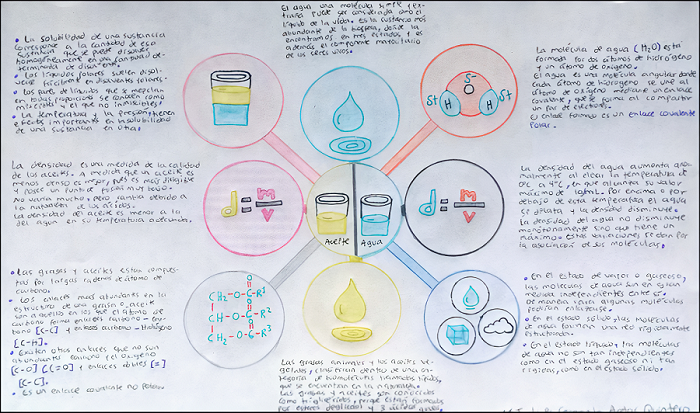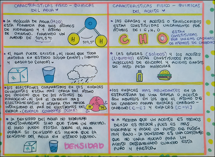 El estudiante 2 elabora un esquema gráfico que en la sección central contiene imágenes asociadas con las diferencias entre el agua y el aceite. Representa de forma gráfica la estructura interna de las dos moléculas y deja ver la formación de la mezcla heterogénea entre las dos sustancias. Los colores utilizados por el estudiante permiten observar claramente el correcto ordenamiento de la mezcla. De otra parte, en la sección derecha se presentan las características propias del agua enfatizando en el tipo de enlace químico, el estado físico y la densidad. La sección izquierda consolida las características de las grasas y aceites siguiendo la misma estructura. La presentación del esquema sugiere un proceso de lectura detallado, la correcta comprensión y categorización de los contenidos, y pone en evidencia la imaginación del estudiante.