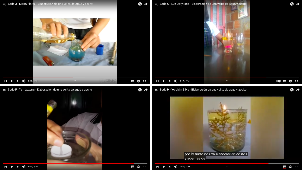 En lo que corresponde a la Sección 3, o actividades de cierre, fue evidente el gusto de los estudiantes por las temáticas de carácter ambiental y por la ejecución del experimento de aplicación en el que debían hacer un video sobre la elaboración de una velita ecológica de agua y aceite. La Figura 5 consolida algunas de las imágenes captadas en los videos realizados por los participantes del grupo.