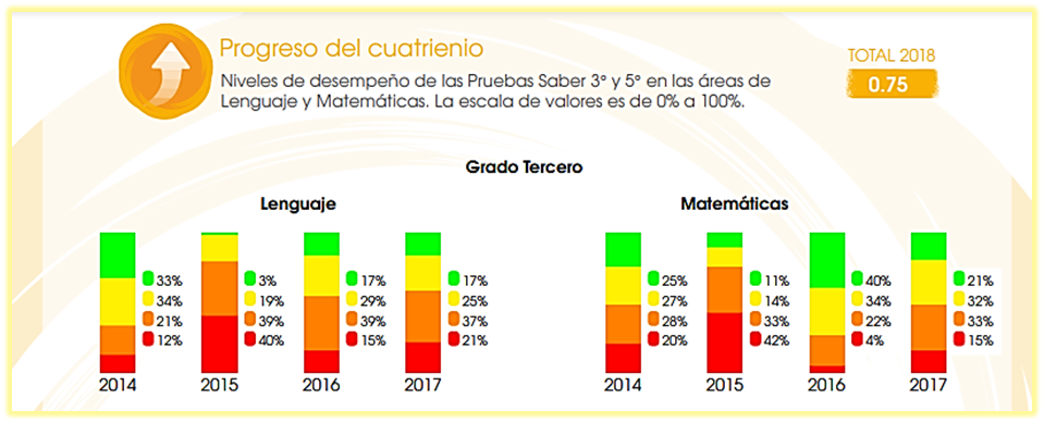 Como sustento de esta argumentación, los resultados de las Pruebas Saber para el año 20182, en alumnos de tercer grado, dan una visión de los desempeños alcanzados por los estudiantes en los procesos de área del lenguaje en el año 2017, ubicando al 21 % de los estudiantes en un nivel de desempeño insuficiente, 37 % mínimo, 25 % satisfactorio, y tan solo el 17 % presentan un desempeño avanzado (ver Figura 2). Es preciso reconocer que los objetivos de la educación se reflejan más allá de cifras cuantificables, pero estos datos, ofrecen un norte para reflexionar sobre la necesidad de plantear alternativas que conlleven a fortalecer los procesos.