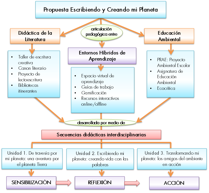 Al tener en cuenta los aspectos mencionados con anterioridad, las secuencias didácticas se diseñaron en forma de actividades consecutivas, articuladas y ejecutables, soportadas en dos ejes fundamentales: la didáctica de la literatura con las estrategias para vincular el mundo literario en los procesos y la educación ambiental con actividades para dinamizar la creación literaria a partir de la experiencia con el entorno. Dos ejes mediados por los recursos de educación híbrida y sintetizada en el fomento de la ecocrítica. En total tres unidades didácticas que se desarrollan en forma de cinco sesiones de trabajo o clases cada una.