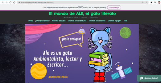 De esta manera se puso a disposición de la comunidad educativa un espacio virtual que facilita la exploración de las secuencias didácticas, el acceso al material formativo, el canon literario, los recursos interactivos y la identificación del contexto escolar. Lo anterior, clasificado en la barra menú de la página web, lo que facilita la navegación por el entorno. El menú de la página web se compone de las siguientes opciones: Inicio, ¿De qué vamos?, ¡Vamos a la aventura!, Planeta Escuela, Planeta Biblioteca y Los amigos de Ale. En la opción Inicio aparece una presentación interactiva sobre el personaje Ale, el gato literato. En la sección denominada ¿De qué vamos? se explican las generalidades y los alcances de la propuesta pedagógica. ¡Vamos a la aventura! es la sección correspondiente al desarrollo de las secuencias didácticas. Planeta Escuela es un apartado dedicado a la descripción del contexto escolar y la población de estudio. Planeta Biblioteca corresponde al canon literario organizado por géneros y tipologías textuales y Los amigos de Ale es un componente de la página web donde aparecen personajes y líderes ambientales naciones y locales con sus redes sociales para que los estudiantes interactúen.