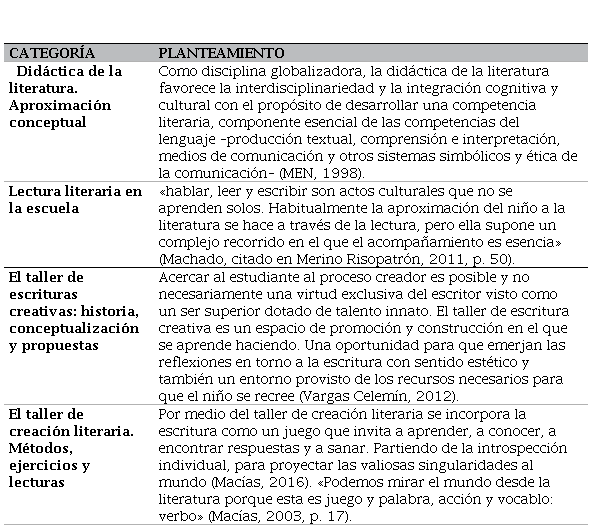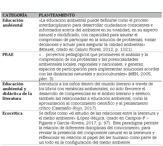 Se realizó una revisión documental, un rastreo de antecedentes y la selección del corpus teórico necesario para estructurar la propuesta, tomando como espacio de tiempo las publicaciones desde el año 2000 a la fecha en bases de datos de consulta académica (Google Scholar, Dialnet, Scielo, Redalyc, UNIR, Repositorio de la Universidad del Tolima, entre otros). De esta manera se determinaron las categorías que fundamentan la propuesta pedagógica de la siguiente manera: didáctica de la literatura (ver Tabla 1), educación ambiental (ver Tabla 2) y ambientes híbridos de aprendizaje (ver Tabla 3).