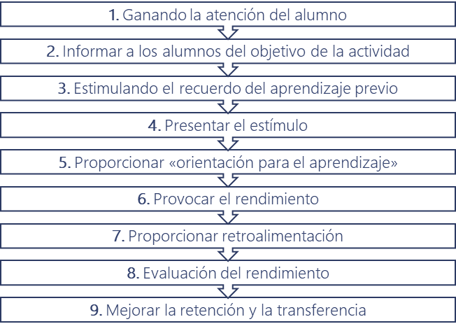En este sentido, Gagné et al. (1992) presentan nueve condiciones para el modelo pedagógico instructivo que vive dentro del enfoque b-learning y que claramente enfoca la necesidad de potenciar la interactividad en el proceso de enseñanza virtual a través de estos nueve caminos (ver Figura 1) para que se presente un aprendizaje significativo procesual en la virtualidad.