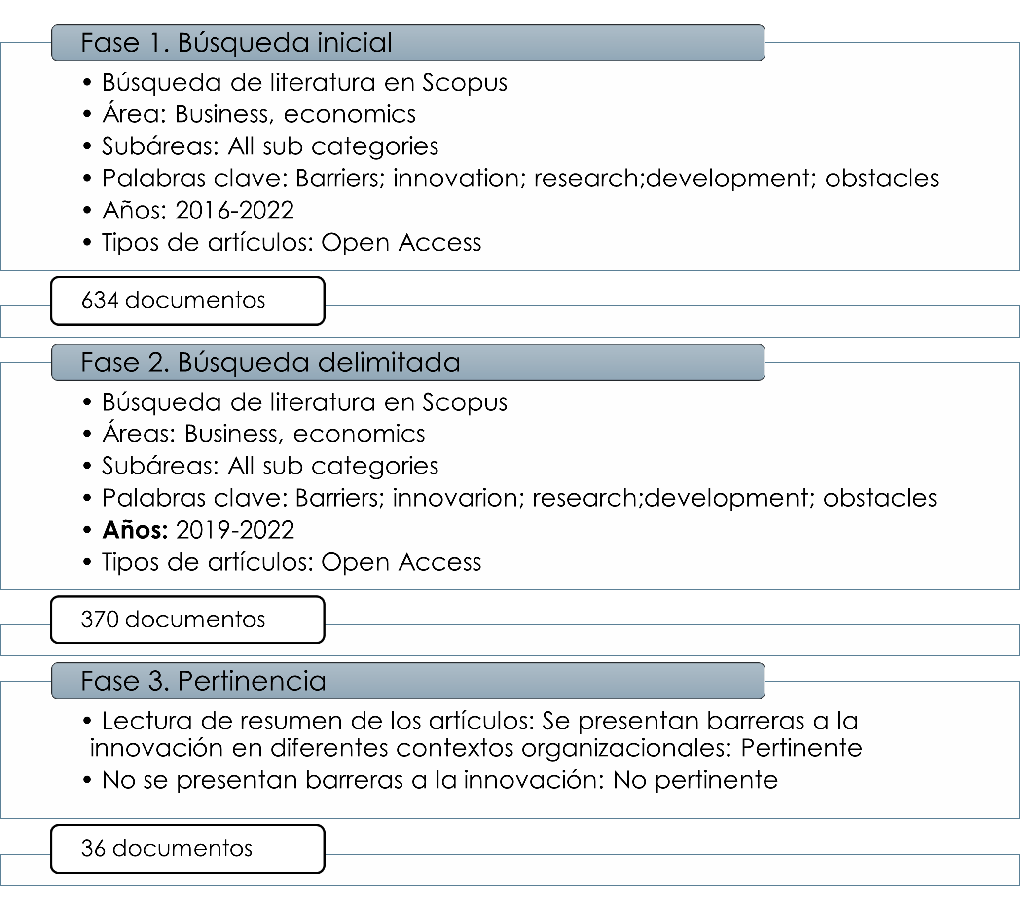 Se seleccionaron veintiséis documentos que cumplían con las condiciones iniciales, es decir, son publicaciones entre 2019 y 2021, que trataran como tema central las barreras a la innovación (financieras, de mercado, de conocimiento u otro tipo) y que no necesariamente usaran el enfoque de barreras a la innovación del Manual de Oslo. La Figura 1 resume la metodología empleada para la identificación de publicaciones relevantes desde la ecuación de búsqueda propuesta.
