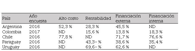 Se entiende como barreras financieras todas aquellas que de manera interna o externa tienen incidencia en el flujo de caja de las organizaciones. Según lo planteado por Wralsen et al. (2021), dichas barreras financieras se definen como desafíos en la viabilidad financiera y la incertidumbre de los inversores al momento de entrar al negocio. Normalmente, en las barreras financieras se incluyen la falta de flujo de caja al interior de la compañía, la falta de recursos externos (bancos, socios, etc.), los altos costos de la generación de innovaciones y la baja rentabilidad producida por estos últimos. Al consultar los resultados de las encuestas de innovación en países como Argentina, Colombia, Chile, Paraguay y Uruguay, se encuentra que las barreras financieras son percibidas en alto grado por las empresas, como se presenta en la Tabla 1.