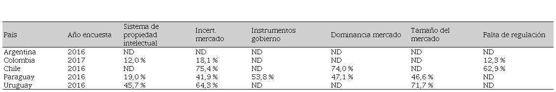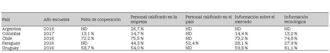 Aunque las diferentes metodologías de medición no permiten una comparación uno a uno de los resultados de las encuestas, sí es posible observar que las empresas de estos países se han visto afectadas por las barreras a la innovación.