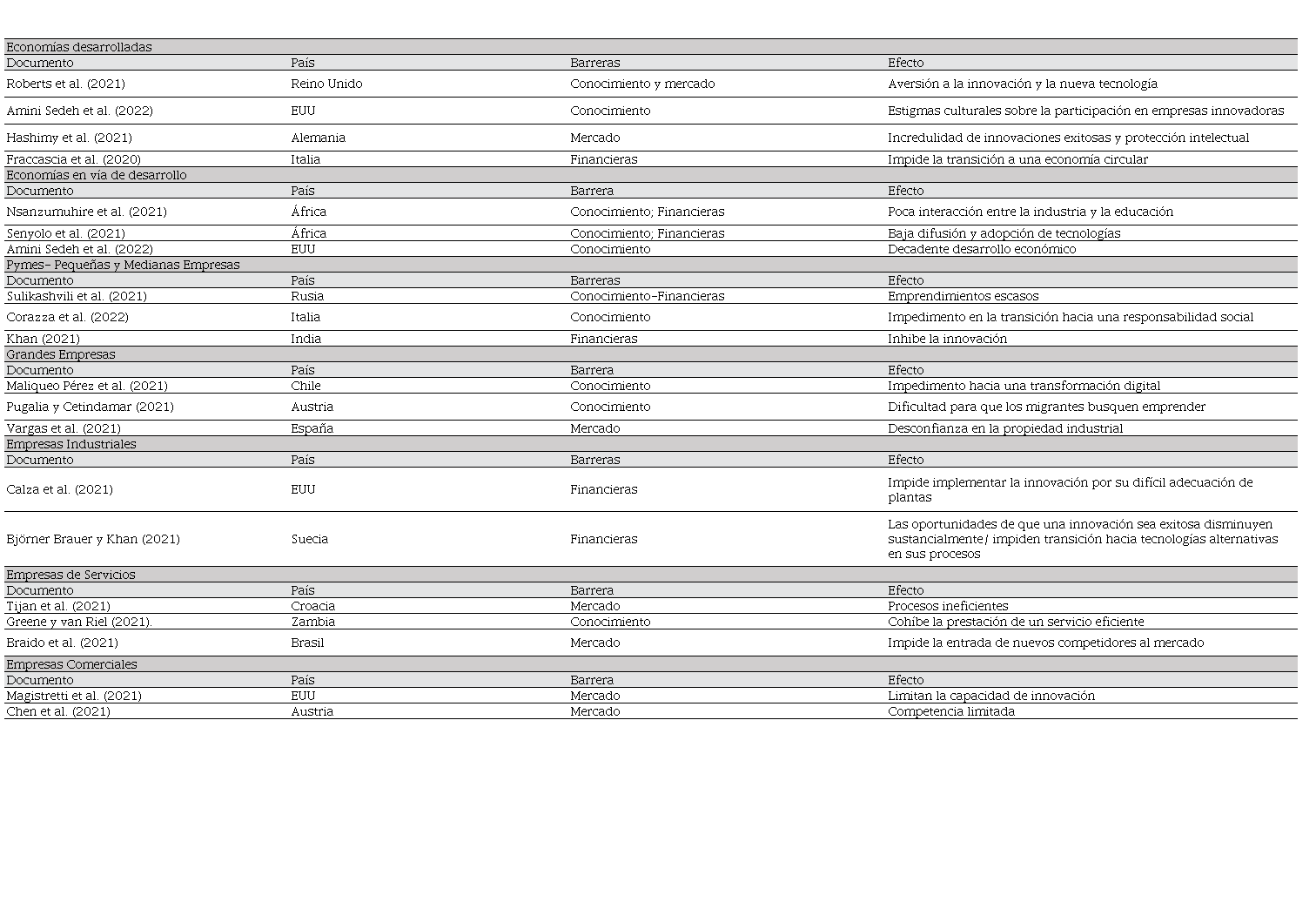 Dentro de los documentos revisados se puede ver que, de alguna forma, los autores sí encuentran que las barreras a la innovación, aun cuando no necesariamente siguen la misma tipología del Manual de Oslo, concuerdan con este último en que existen los mismos tres grandes grupos de barreras: financieras, de conocimiento y de mercado. Esta revisión presenta diferentes agrupaciones entre los hallazgos, donde se comparan en cuatro categorías: enfoque económico (economías desarrolladas vs economías en vías de desarrollo), enfoque tamaño de empresa (pymes vs grandes empresas) y enfoque basado en sectores empresariales (comerciales, industriales o de servicios) y según el tipo de efecto de la barrera a la innovación que se abordó en la literatura. Esta relación y hallazgos se resumen en la Tabla 6.