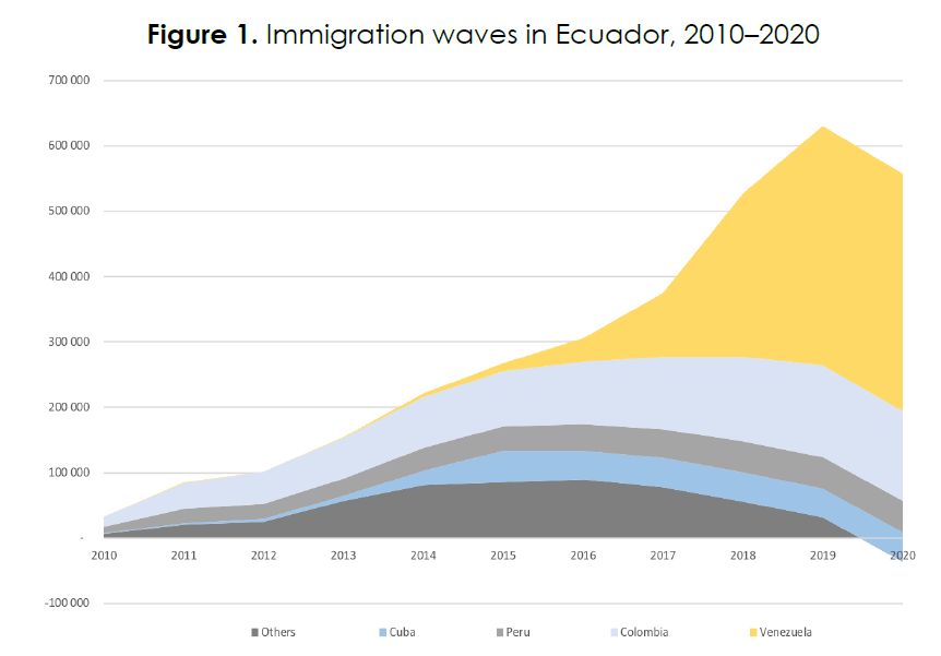 During the last decade, Ecuador has received more than 630,000 migrants. Most of them have come from Venezuela (58%), Colombia (22%), Peru (8%) and Cuba (7%). Even when Ecuador’s appeal began to diminish after 2015, the intensification of the negative conditions in neighbouring countries (i.e., Colombia’s internal war and Venezuela’s political and economic crisis) maintained the migrant inflow until the end of the decade. The COVID-19 pandemic marked a new breaking point in 2020: about 75,000 immigrants left the country in that year (see Figure 1).