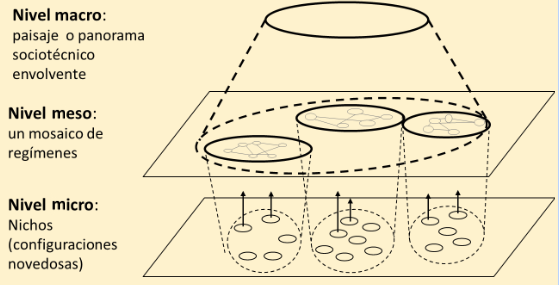Las transiciones deben entenderse como procesos a largo plazo que cambian estructuras, prácticas y culturas profundamente arraigadas. Estas transiciones dan como resultado una profunda transformación de un sistema en múltiples dimensiones: tecnología, economía, actores involucrados, regulación, ciencia, patrones de producción, preferencias de los consumidores, políticas, infraestructuras, mercados, relaciones de poder, discursos sobre definiciones y soluciones de problemas, instituciones y significados culturales, por citar algunos (Grin et al., 2010). La perspectiva multinivel describe de este modo las transiciones sociotécnicas como una interacción entre estos tres niveles, los cuales se interrelacionan como una jerarquía anidada: los nichos están incrustados dentro de los regímenes, que a su vez están incrustados en los paisajes (Paredis, 2013).
