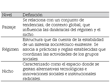 Como teoría de rango medio, la perspectiva multinivel conceptualiza los patrones dinámicos generales en procesos de transición de sistemas sociotécnicos. Este marco articula microsupuestos teóricos de la economía evolutiva, los estudios de la ciencia y la tecnología, la teoría de estructuración y el neoinstitucionalismo en tres niveles (ver Figura 1): el nicho, entendido como el lugar en el que se gestan alternativas tecnológicas e innovaciones radicales; el régimen, como el espacio donde las prácticas establecidas y las reglas asociadas estabilizan los sistemas imperantes; y el paisaje, que representa un contexto más amplio, o tendencias, que influyen las dinámicas del régimen y el nicho (Schot y Geels, 2008; Geels, 2011).