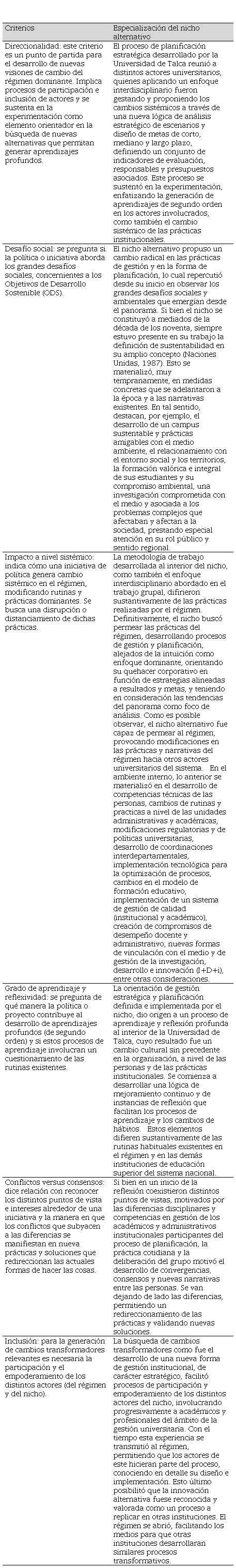 Varias son las razones que explican el proceso de cambio transformativo que tuvo lugar en la evolución del nicho alternativo desarrollado por la Universidad de Talca, iniciada la década de los años noventa, y la manera en que este espacio se comportó como tal, en contraposición al régimen dominante del sistema de educación superior chileno. En la Tabla 4 se describen los criterios de reconocimiento, analizando la manera cómo el nicho se comportó en función de la categorización sugerida.