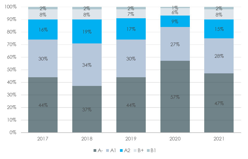 No obstante, en Colombia sigue siendo notorio el problema del bajo nivel de competencia en el idioma inglés alcanzado por los estudiantes al finalizar su escolaridad, y este resultado se ve reflejado en las Pruebas Saber, evaluación que realiza cada año el Estado a través del Instituto Colombiano para la Evaluación de la Educación (ICFES). Los datos estadísticos reflejan niveles inferiores a la meta propuesta en el Plan Nacional de Bilingüismo y el Plan de Mejoramiento de la Calidad Educativa para 2025, en donde se aspira lograr niveles de suficiencia en lengua extranjera B1 (Pre intermedio) al finalizar la escolaridad (Ministerio de Educación Nacional [MEN], 2020). Estos niveles están descritos por el Marco Común Europeo de referencia para la enseñanza de lenguas extranjeras, el cual establece los niveles A1-A2 para los niveles básicos, B1-B2 para el nivel intermedio y C1-C2 para el nivel avanzado. Actualmente, solo el 2 % de la población estudiantil alcanza esta meta al año 2021 (ver Figura 1).