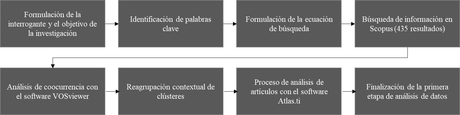Esta investigación es cualitativa y documental, con apoyo epistemológico en la hermenéutica, considerando el análisis de textos escritos. El procedimiento inició con una primera fase correspondiente al análisis bibliométrico. Este análisis se desarrolló con la técnica citation pearl growing, de Schlosser et al. (2006), que implica la elaboración de la ecuación de búsqueda con los términos de la temática estudiada, los cuales se involucraron al inicio de estas ecuaciones de búsqueda. El resultado arrojó 435 artículos.