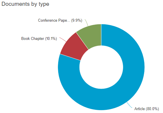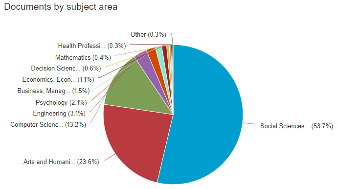 De acuerdo con los tipos de documentos publicados, que se muestran en la Figura 4, es notorio el dominante 80 % de artículos científicos, seguido por capítulos de libro con el 10.1 % y, en tercer lugar, los documentos de conferencia con el 9.9 %. Esto hace resaltar las bases científicas por áreas de conocimiento que se pronuncian por medio de diferentes grupos de investigaciones, desde donde se dejan conocer, en primer lugar, las ciencias sociales, con el 53.7 %, seguido de las artes y humanidades, con el 23.6 %, dejando un tercer lugar a las ciencias de la computación, con el 13.2 %, y las demás áreas con el resto de las participaciones menores. De esta manera, se evidencia la importancia y vigencia que aún se sostiene sobre esta temática del aprendizaje compartido como didáctica de la enseñanza del inglés a través de diferentes áreas de conocimiento, mostrado en la Figura 5.