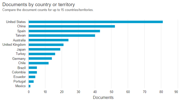 Las publicaciones que dan origen a la Figura 6 exponen como líder en las publicaciones sobre temáticas de idiomas con el aprendizaje compartido, en primer lugar, a los Estados Unidos, seguido de China y, en tercer lugar, España, apreciándose un cuarto lugar para Taiwán, que es seguido por Australia y el Reino Unido, continuando con Japón, Turquía y Alemania. Luego continúan otros países, dentro de los cuales se encuentran algunos latinoamericanos como Chile, Brasil, Colombia, Ecuador y México.