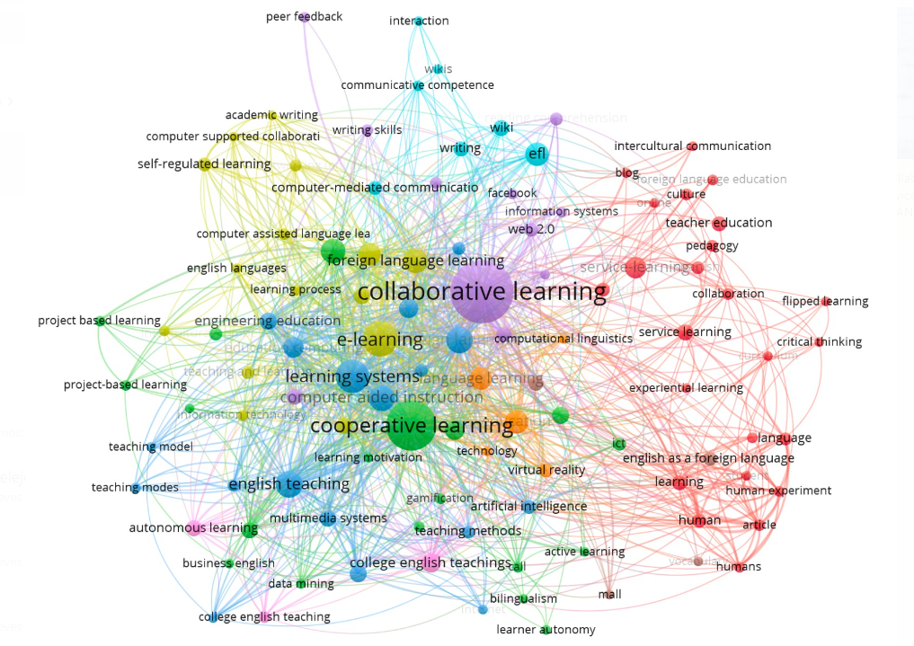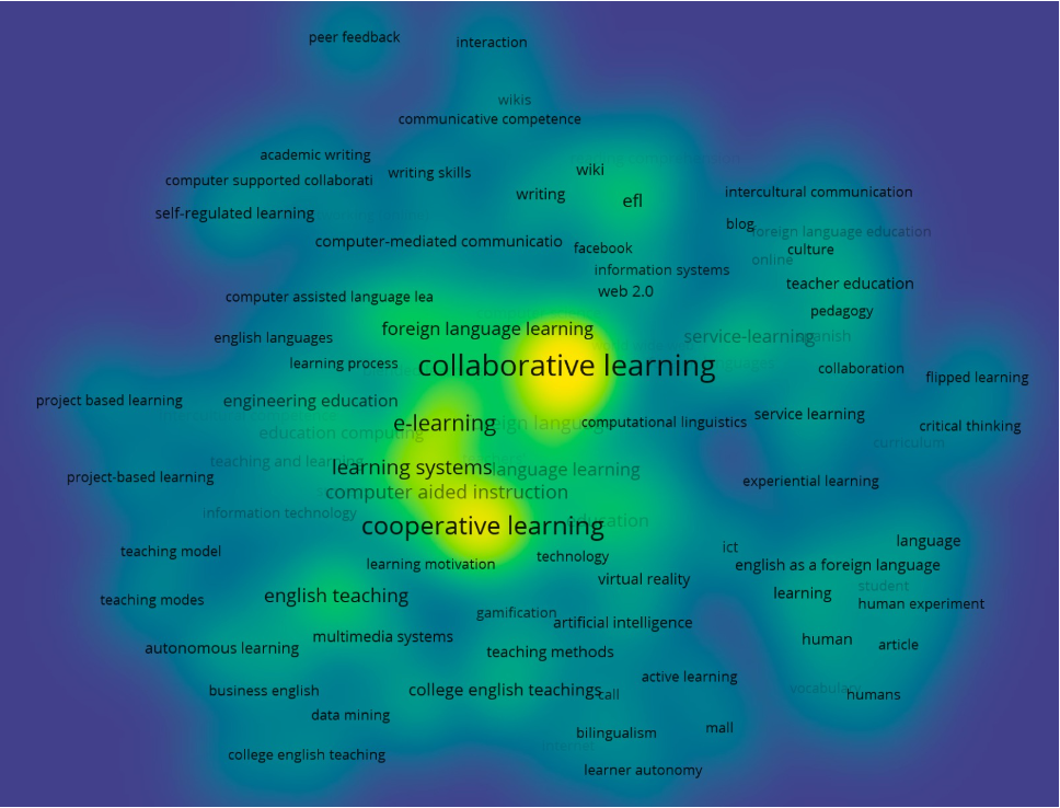 En la continuación de esta primera fase de análisis de la literatura, se avanzó al análisis de coocurrencia y de términos con el software VOSviewer®, considerando los 435 artículos seleccionados con la correspondiente ecuación de búsqueda en Scopus. Entre estos artículos surgieron los términos coocurrentes, por medio del análisis de los resúmenes y las palabras clave. El resultado mostró gráficamente, en la Figura 7, los términos de mayor énfasis comúnmente estudiados en los documentos revisados, que fueron: (1) aprendizaje colaborativo, (2) aprendizaje cooperativo, (3) enseñanza del inglés, (4) inglés como lengua extranjera, (5) aprendizaje servicio, (6) enseñanza del inglés, (7) bilingüismo. Estos clústeres se sintetizaron contextualmente en los dos de mayor fuerza y significancia: a) aprendizaje colaborativo, b) aprendizaje cooperativo. Seguidamente, se muestra el mapa de calor con estos términos, donde se pueden apreciar con mayor precisión la cercanía relacional de los términos clave (Figura 8).