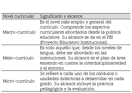 El Ministerio de Educación Nacional formuló un currículo sugerido en inglés que se define como un «Todo en sí mismo», un sistema interrelacionado con el contexto, implementado de forma abierta y simultánea (MEN, 2016). Este currículo se compone de tres niveles de acción: macro-currículo, meso-currículo y micro-currículo (ver Tabla 2), basados en los postulados de Posner (2005). Estos niveles incluyen programas de estudio, esquema de contenido, estándares, libros de texto, rutas de estudio y experiencias planeadas.