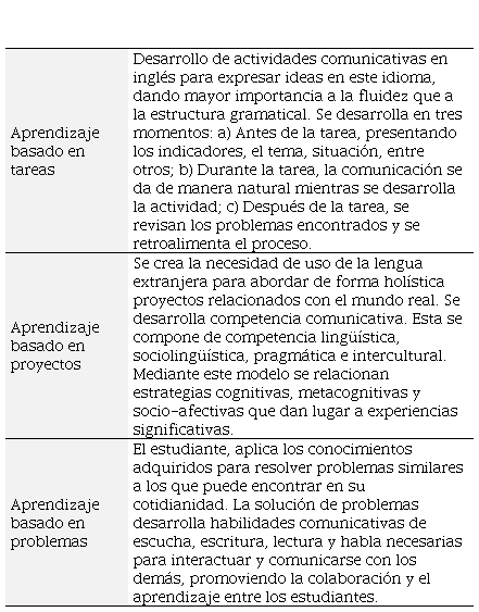El aprendizaje basado en proyectos es un enfoque holístico y democrático que motiva a los alumnos a participar en la planificación, el desarrollo y la evaluación de los proyectos. Ayuda a desarrollar la competencia comunicativa y la apreciación intercultural (MEN, 2006). Las estrategias cognitivas, metacognitivas y socioafectivas pueden relacionarse entre sí a través del aprendizaje basado en proyectos, dando lugar a experiencias significativas. Por su parte, el aprendizaje basado en problemas (ABP) anima a los alumnos a aplicar sus conocimientos para resolver problemas de la vida real. Integra nuevos conocimientos y se centra en el desarrollo de las habilidades comunicativas necesarias para interactuar con los compañeros. Esto fomenta la colaboración y el aprendizaje compartido. Los tipos de aprendizaje, según el MEN (2016), se resumen en la Tabla 3.