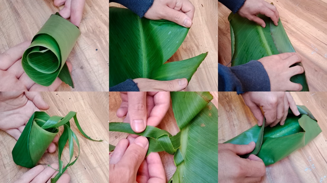 En términos generales, en lo referente a la hoja de achira, por su tamaño más pequeño, en comparación con la hoja de plátano, y su grosor delgado, mayoritariamente se plegó en dos mitades a partir de un eje axial natural generado por la nervadura. Así mismo, debido a las secciones paralelas, a partir de la misma nervadura, los participantes elaboraron estructuras cónicas y cilíndricas, apoyándose con las puntas de las hojas que actuaban como pequeños sujetadores. Por otra parte, también se observó que algunos participantes deshebraron las hojas para obtener tirillas delgadas a manera de cintas, con las cuales elaboraron estructuras trenzadas (ver Figura 9).