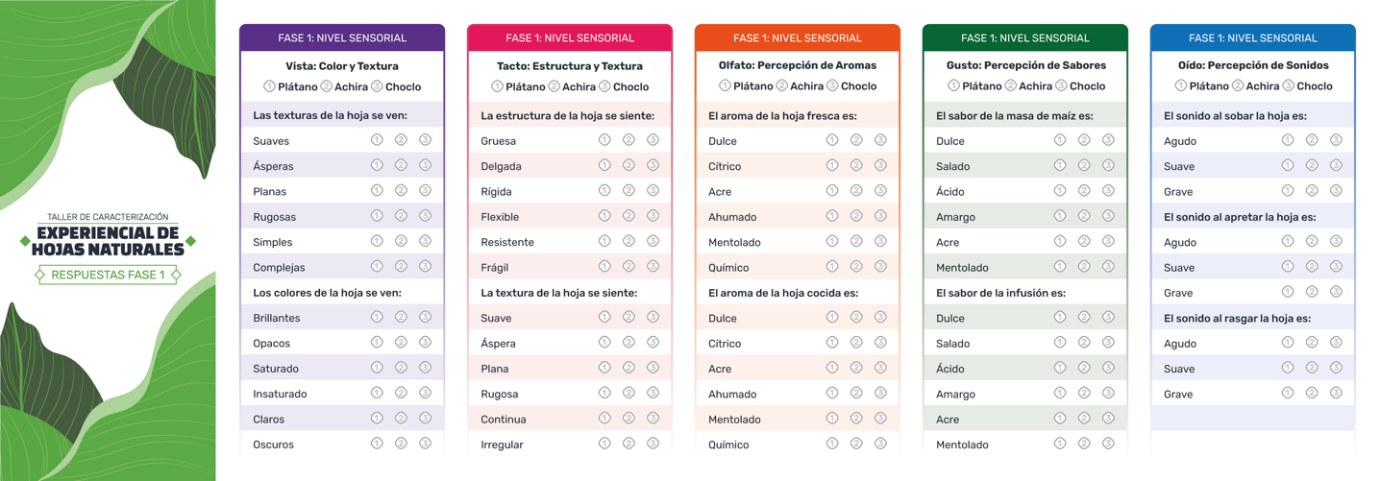 Para el nivel sensorial, la indagación se centró en la observación de la experiencia de los participantes, a través de la vista, el tacto, el olfato, el gusto y el oído. En cada sentido, se hizo énfasis en los aspectos generales que se consideraron al momento de abordar el carácter experiencial, con base en términos cotidianos y presentados con sus respectivos antónimos, junto con conceptos de diseño básico, conocidos por todos los participantes (ver Figura 2). Además de las hojas frescas que componían el kit, se emplearon otros recursos como las hojas cocidas y sus respectivos extractos, con trozos de masa básica de maíz envuelta y cocida en las hojas, para afianzar la experiencia en sentidos como el olfato y el gusto (ver Figura 3).