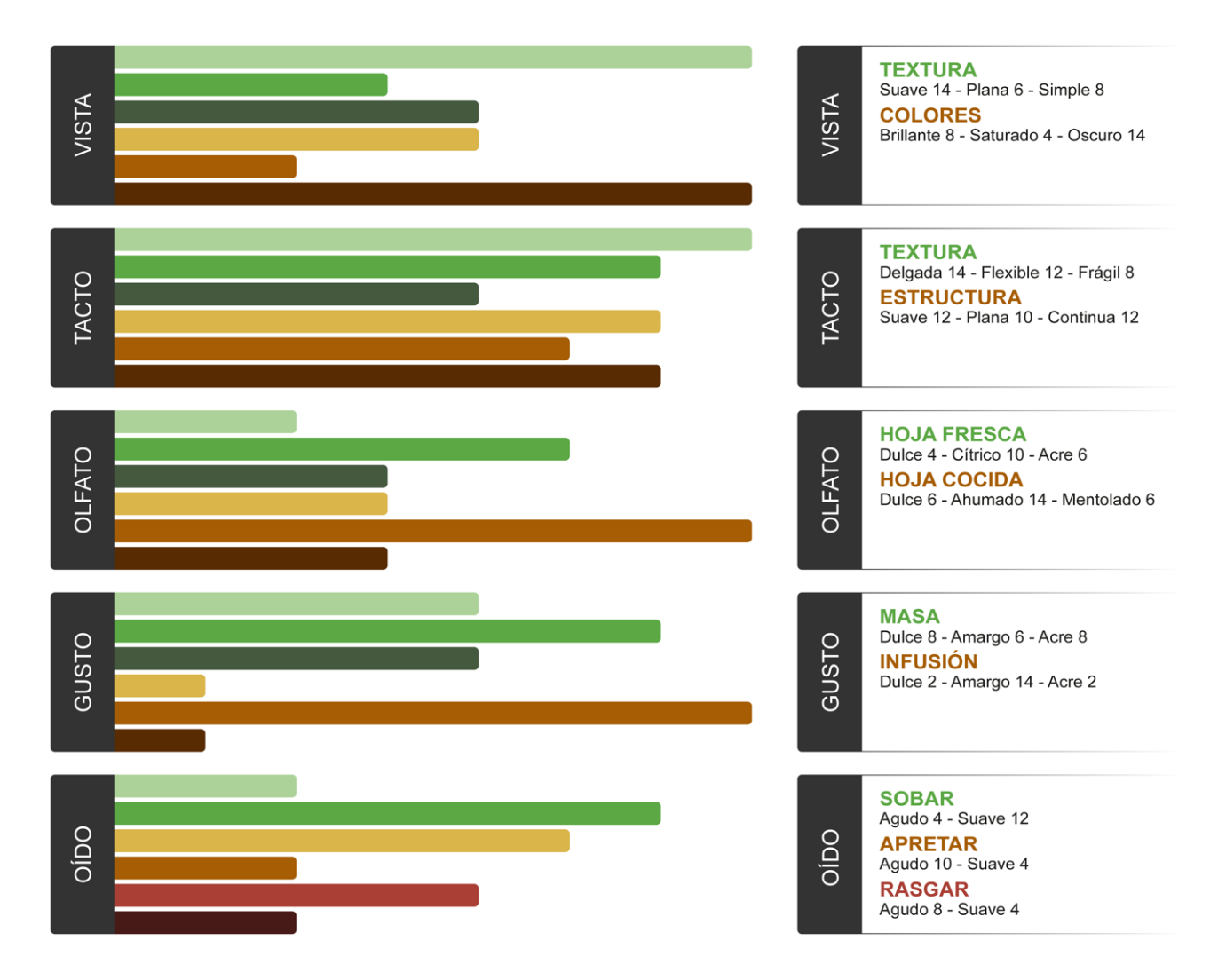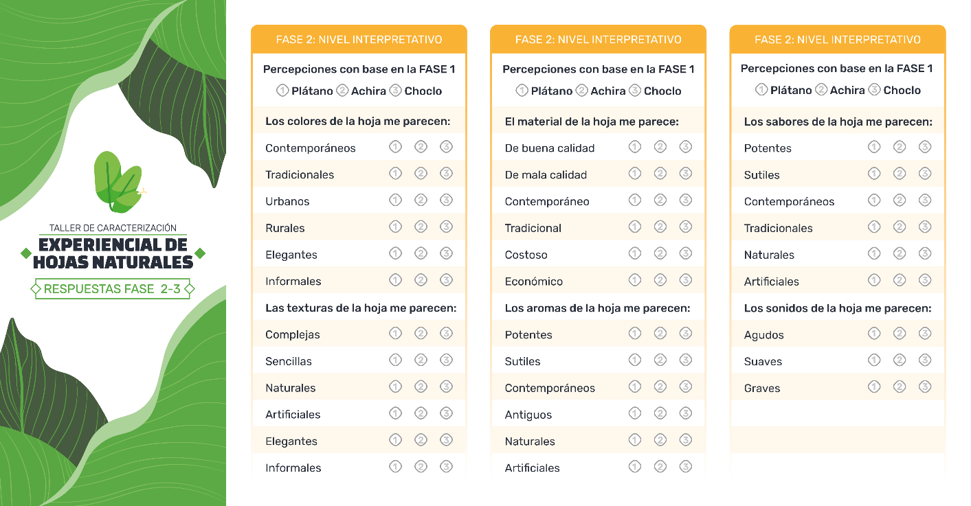 En el nivel interpretativo, se planteó una indagación acerca de las características de las tres hojas en correlación con las percepciones cotidianas que usualmente tienen las personas sobre estos materiales, independientemente de su origen, composición o uso. Así mismo, dichas interpretaciones se originan de la apreciación preliminar derivada del nivel sensorial, de tal manera que, colores, texturas, materiales, aromas, sabores y sonidos, se convierten en los insumos base para la elaboración del instrumento en esta fase (ver Figura 4).