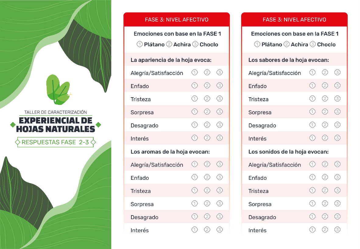 El diseño de la herramienta en el nivel afectivo también se derivó de las emociones provocadas durante la experiencia del nivel sensorial, que luego se trasladaron al plano subjetivo; por lo tanto, se indagó sobre las evocaciones de apariencia, aromas, sabores y sonidos en las hojas, que configuran las experiencias de este nivel mediante unas características comunes para las cuatro instancias, a saber: alegría-satisfacción, enfado, tristeza, sorpresa, desagrado e interés (ver Figura 5).