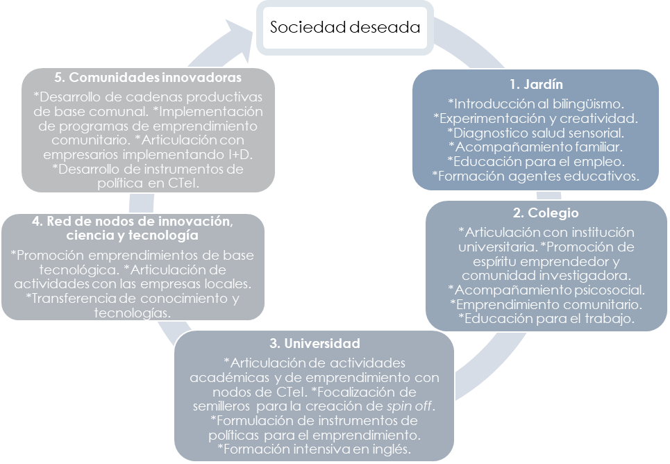 En particular, el CV busca integrar ciclos vitales con ciclos productivos bajo tres componentes principales: salud sensorial, enfocado en atención medica física; psicosocial, dirigido al acompañamiento psicológico y vocacional; y pedagógico, para la promoción del pensamiento creativo y científico, distribuidos en cinco eslabones articulados entre sí y secuenciales –jardín, colegio, universidad, red de nodos de innovación, ciencia y tecnología, y comunidades innovadoras– para llegar a «la sociedad deseada» (ver Figura 1). Según Aristizabal Hincapié (2019), el CV es definido como: