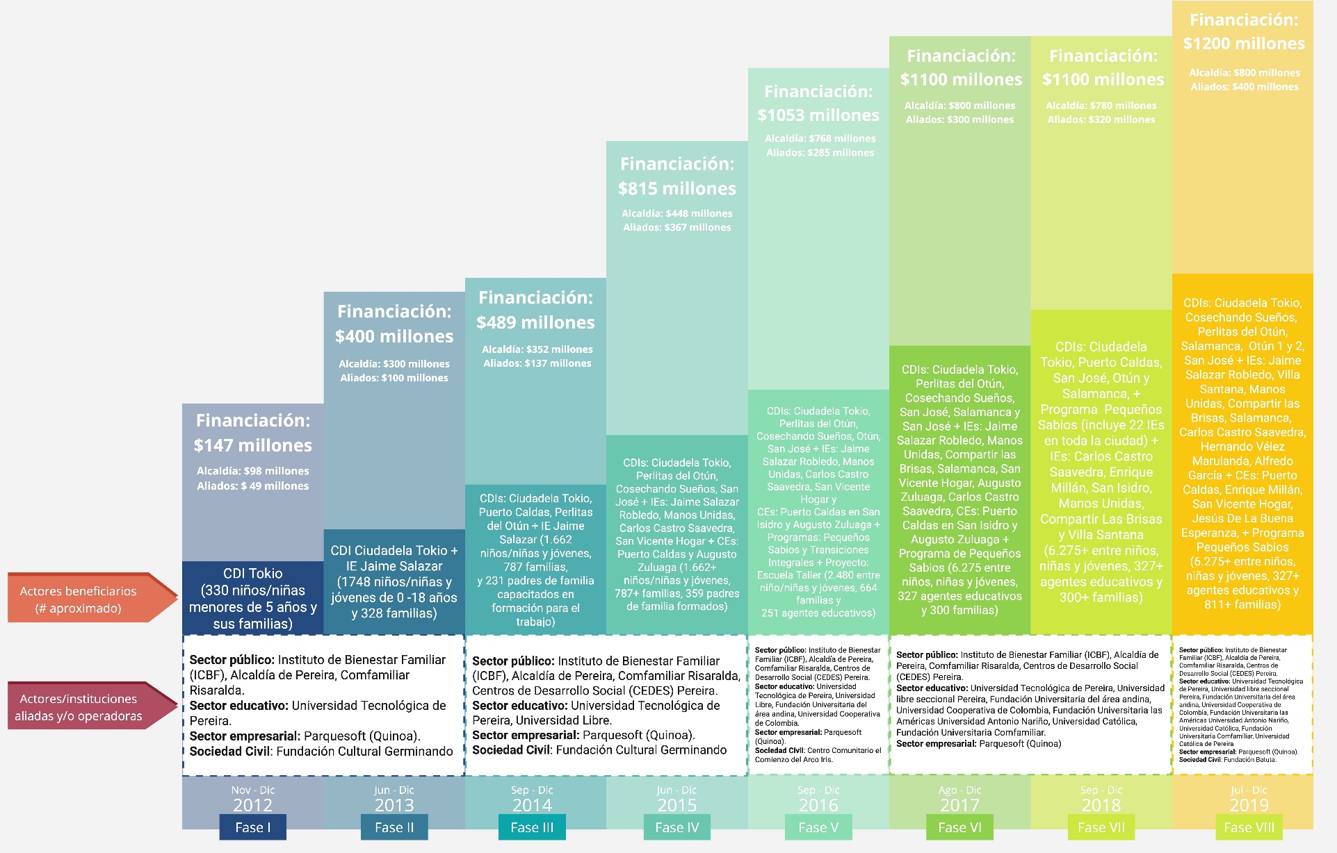 Su ejecución se dividió en ocho fases, desarrolladas entre 2012 y 2019, en las que, de manera escalonada, se buscaba integrar, tanto los diversos enfoques establecidos en los tres componentes, así como diferentes actores entre beneficiarios y aliados del proyecto. La Figura 2 condensa el número aproximado de beneficiarios, familias y agentes educativos intervenidos por el CV a través de los años, y los actores aliados que se fueron sumando a través del tiempo y a partir de los recursos obtenidos en cada de una de las fases.